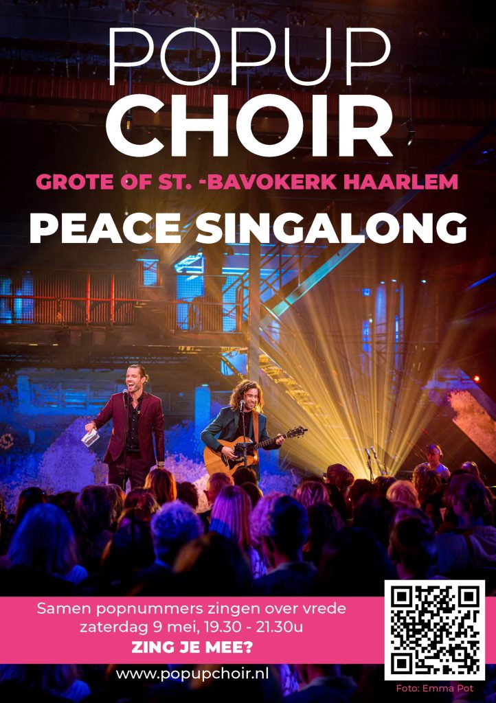 Samen zingend de vrede vieren: op zaterdag 9 mei verandert de Grote of St.-Bavokerk in één grote zangzaal tijdens de Peace Singalong van Popup Choir. Samen bekende popnummers over vrede zingen, onder begeleiding van dirigent Maarten Bos en gitarist Tijmen de Koning. Het belooft een unieke avond te worden waarin muziek, samenzang en verbinding centraal staan.